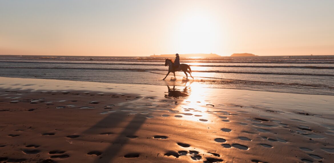 A private horse ride along the beach of Essaouira at low tide. The beach stretches for kilometres here, wide and almost deserted. You ride along the Atlantic surf, the wind in your hair and the ramparts of Essaouira in the distance. For beginners and experienced riders alike, at your own pace. An experience so simple and so perfect that it needs no further explanation.