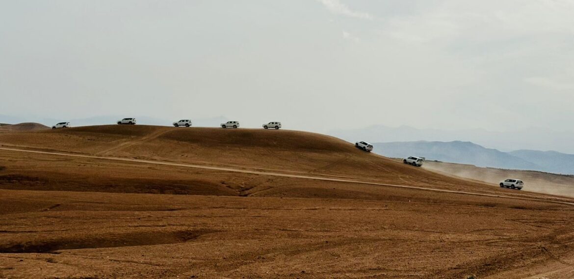 Just forty minutes from Marrakech, a landscape begins that makes you forget you were ever in a busy city. The Agafay plain is a rocky desert of otherworldly beauty. Rolling stone formations, solitary Berber camps, a silence so complete you can almost hear it. In the background, the snow-capped peaks of the High Atlas.